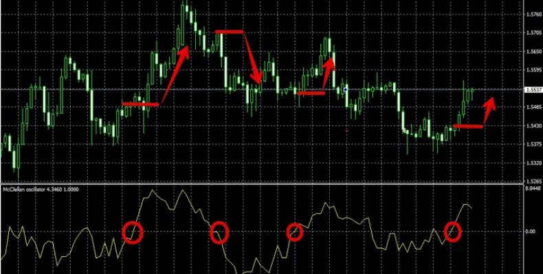 Как уже было сказано выше, Осциллятор Макклеллана основан на разнице числа периодов роста и падения. В таких условиях индикатор определяет устойчивую восходящую или нисходящую тенденцию на Форекс в отношении исследуемого актива. Главной особенностью Осциллятора Макклеллана является возможность отслеживания устойчивой тяги к расширению рынка при растущем движении цены от отрицательного к положительному значению.